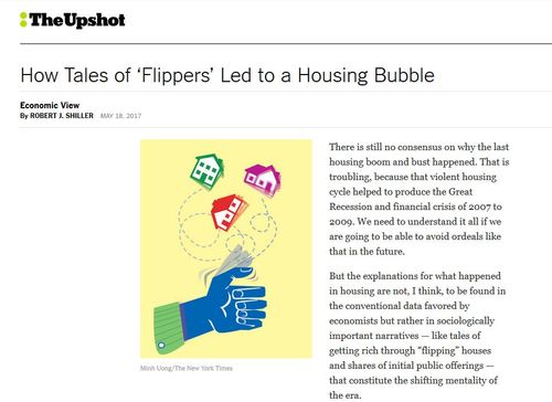 How Tales of ‘Flippers’ Led to a Housing BubbleI don’t doubt that shows on TV about flipping houses played a role. But isn’t it striking that after almost a decade: “There is still no consensus on why the last housing boom and bust happened”? It was the biggest news story since 9/11, and yet Dr. Shiller himself, perhaps the leading housing economist, is still pretty hazy on how it happened.Economic View