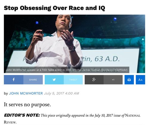 Very interesting that NR is publishing a debate on whether it is okay to discuss race, genes, & IQ. In April, it was "racist by definition". pic.twitter.com/hLNZL8FfvL