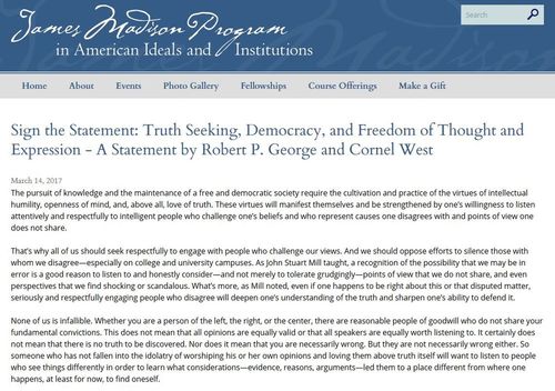 Sign the Statement: Truth Seeking, Democracy, and Freedom of Thought and Expression –Also, the sharp decline in applications to the U. of Missouri after its Black Fall in 2015 (seven dorms are now shuttered) has brought home to campus grown-ups that there can be a cost for egging on shameful behavior.A Statement by Robert P. George and Cornel West