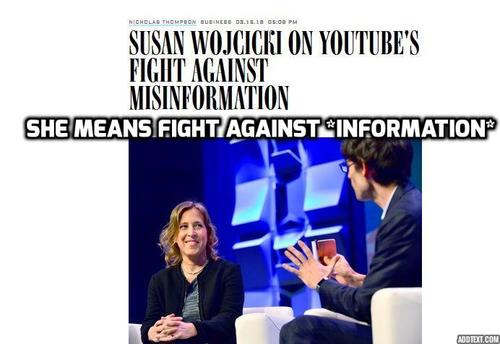 SUSAN WOJCICKI ON YOUTUBE’S FIGHT AGAINST MISINFORMATIONBut, of course, Wired didn’t ask Ms. Wojcicki about her central role in getting James Damore fired. Why not? Well, would you want to get the head censor of the video monopoly mad at you if you put videos on Youtube?WIRED EDITOR-IN-CHIEF NICHOLAS Thompson interviewed YouTube CEO Susan Wojcicki on Tuesday at the South by Southwest festival in Austin, Texas. Here is an edited transcript of the talk.