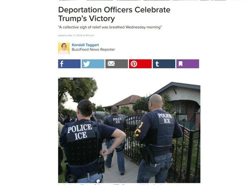 But because of a notable event on Tuesday, November 8, 2016, things are looking up! Kendall Taggart had a post at BuzzFeed News on November 11, headlined Deportation Officers Celebrate Trump's Victory. Subhead: “A collective sigh of relief was breathed Wednesday morning."