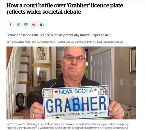 Some woman complained, Nova Scotia's DMV revoked the plate, and Mr Grabher has filed a civil lawsuit to get the plate reinstated.