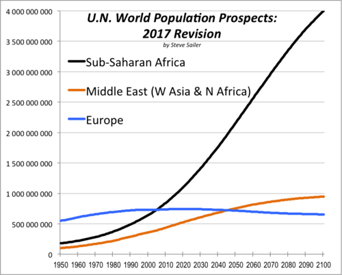 The UN’s new 2017 forecast for the continent of Africa (including North Africa) in 2100 is, once again, higher: up 81 million from the last forecast to a new record of 4,468,000,000.