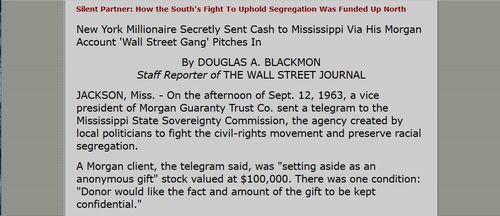 Silent Partner: How the South’s Fight To Uphold Segregation Was Funded Up NorthIn other words, a bank customer had his bank send $100,000 of his own money to a legal organization that used it for lobbying over an important legislative issue before Congress.New York Millionaire Secretly Sent Cash to Mississippi Via His Morgan Account