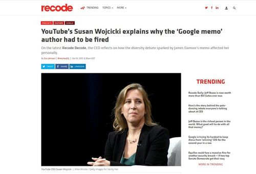 YouTube’s Susan Wojcicki explains why the ‘Google memo’ author had to be firedWell, not equality in the sense of of mom not having a net worth of $300 million because she rented her garage to Larry and Sergey in 1999 and then Aunt Anne was married to Sergey until that gold-digging strumpet got between them and then Aunt Anne was with Uncle Alex, but Alex Rodriguez turned out to be a meathead baseball player, but otherwise … Go Equality!On the latest Recode Decode, the CEO reflects on how the diversity debate sparked by James Damore’s memo affected her personally.