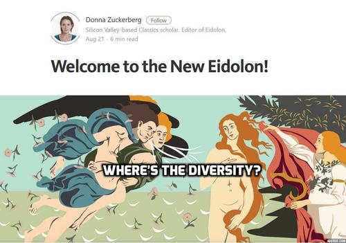 But Eidolon isn’t going to publish articles arguing that identity politics are ruining Classics. I don’t feel any obligation to represent that view here. I don’t believe that political neutrality is either achievable or desirable. Classics as a discipline has deep roots in fascism and reactionary politics and white supremacy, and those ideologies exert a powerful gravitational pull on the discipline’s practitioners.[Comment at Unz.com]If we want to fight those forces, we need to actively work against them.