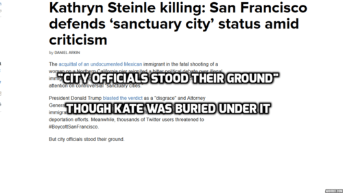 In interviews a few weeks after their daughter's death, Kate's mother denied that she, the mother, was opposed to sanctuary cities. Kate's father, asked whether he thought illegal aliens working the fields in California should be deported, said no, he didn't think they should be deported. Quote: "If you deport them, what are you going to eat? Rocks? I mean, they feed the United States." End quote.