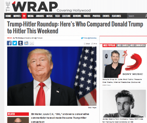 At least David Remnick didn't play the Hitler card. Comparisons of Donald Trump to Hitler have been coming thick and fast lately. Last Sunday night The Wrap — that's a Hollywood website, W-R-A-P, "Wrap" — ran an article headlined Trump-Hitler Roundup: Here's Who Compared Donald Trump to Hitler This Weekend. This was just for the weekend to late on Sunday, mind you. They logged Bill Maher, Louis C.K., Huffington Post, Saturday Night Live, and Glenn Beck — all in one incomplete weekend!
